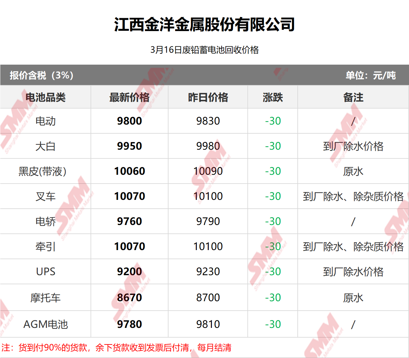SMM 2026/3/17 国内知名再生铅企业废电瓶采购报价