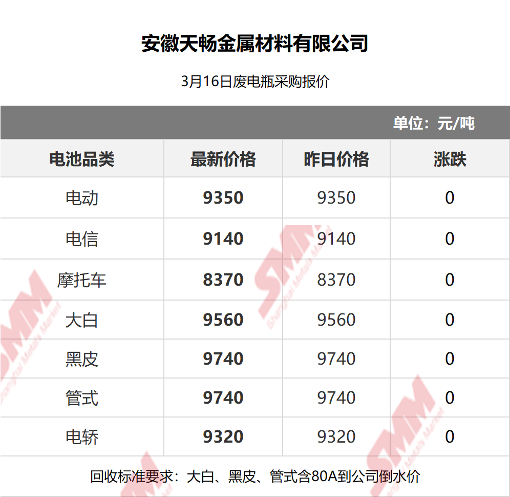 SMM 2026/3/16 国内知名再生铅企业废电瓶采购报价