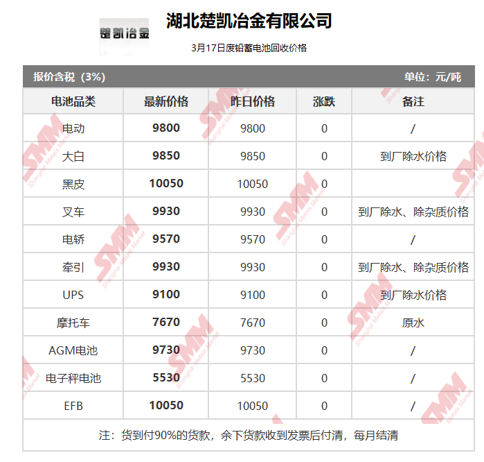 SMM 2026/3/17 国内知名再生铅企业废电瓶采购报价