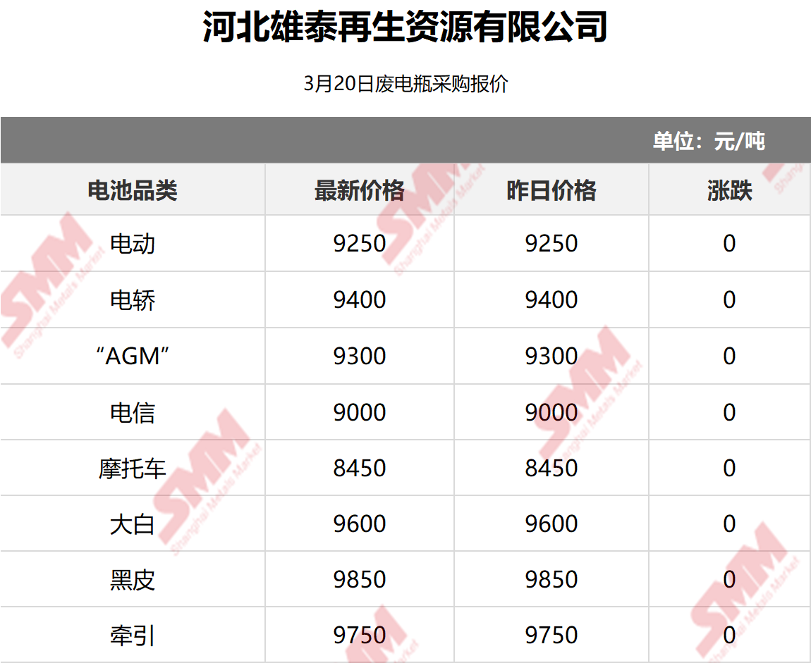 3月20日河北雄泰 废电瓶采购报价