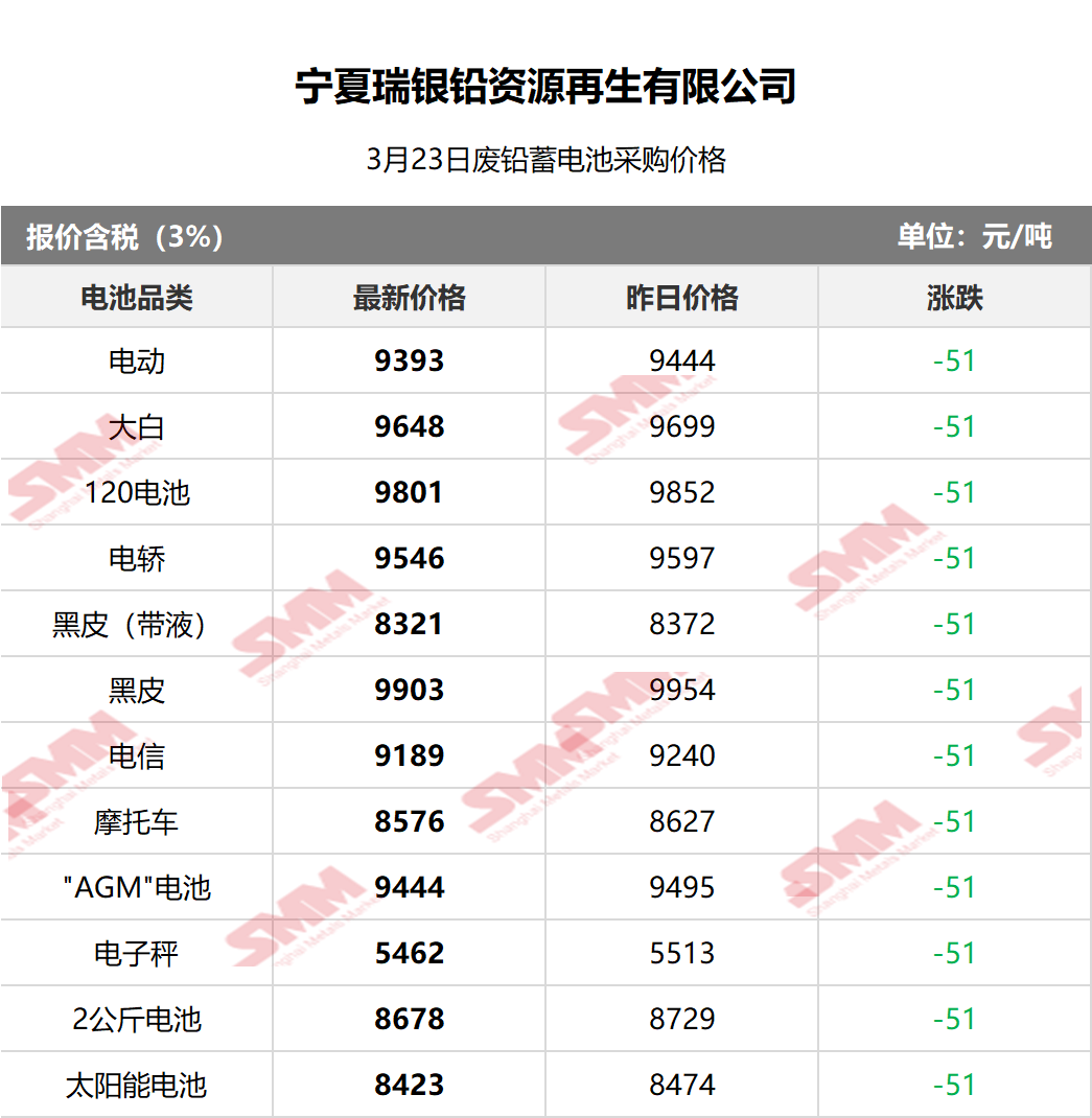 SMM 2026/3/23 国内知名再生铅企业废电瓶采购报价