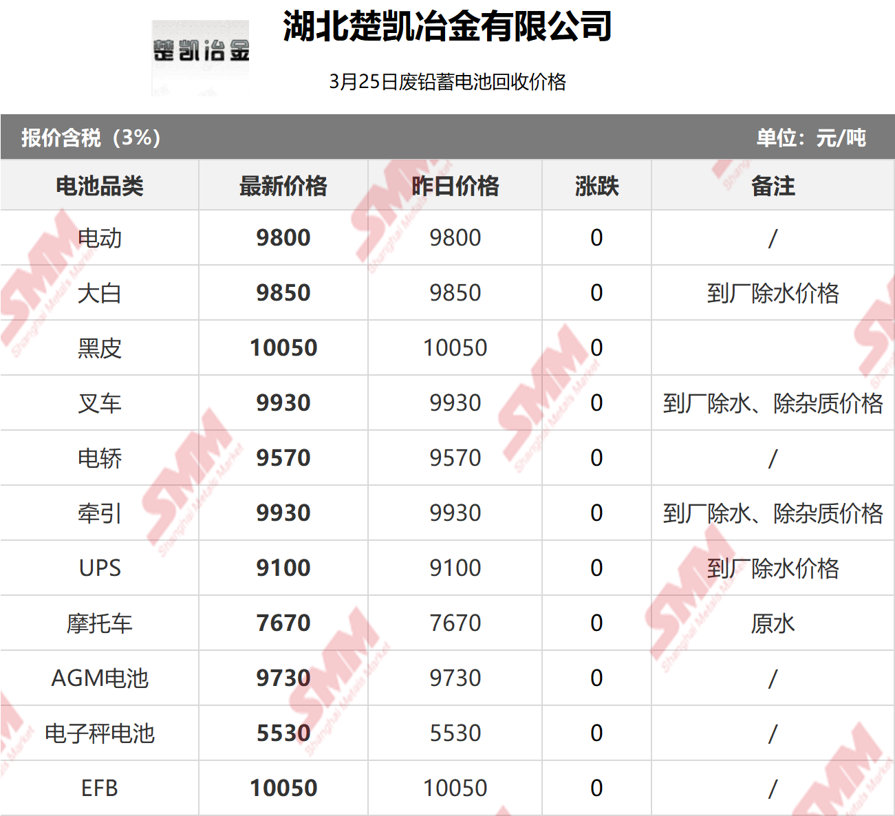 SMM 2026/3/25 国内知名再生铅企业废电瓶采购报价