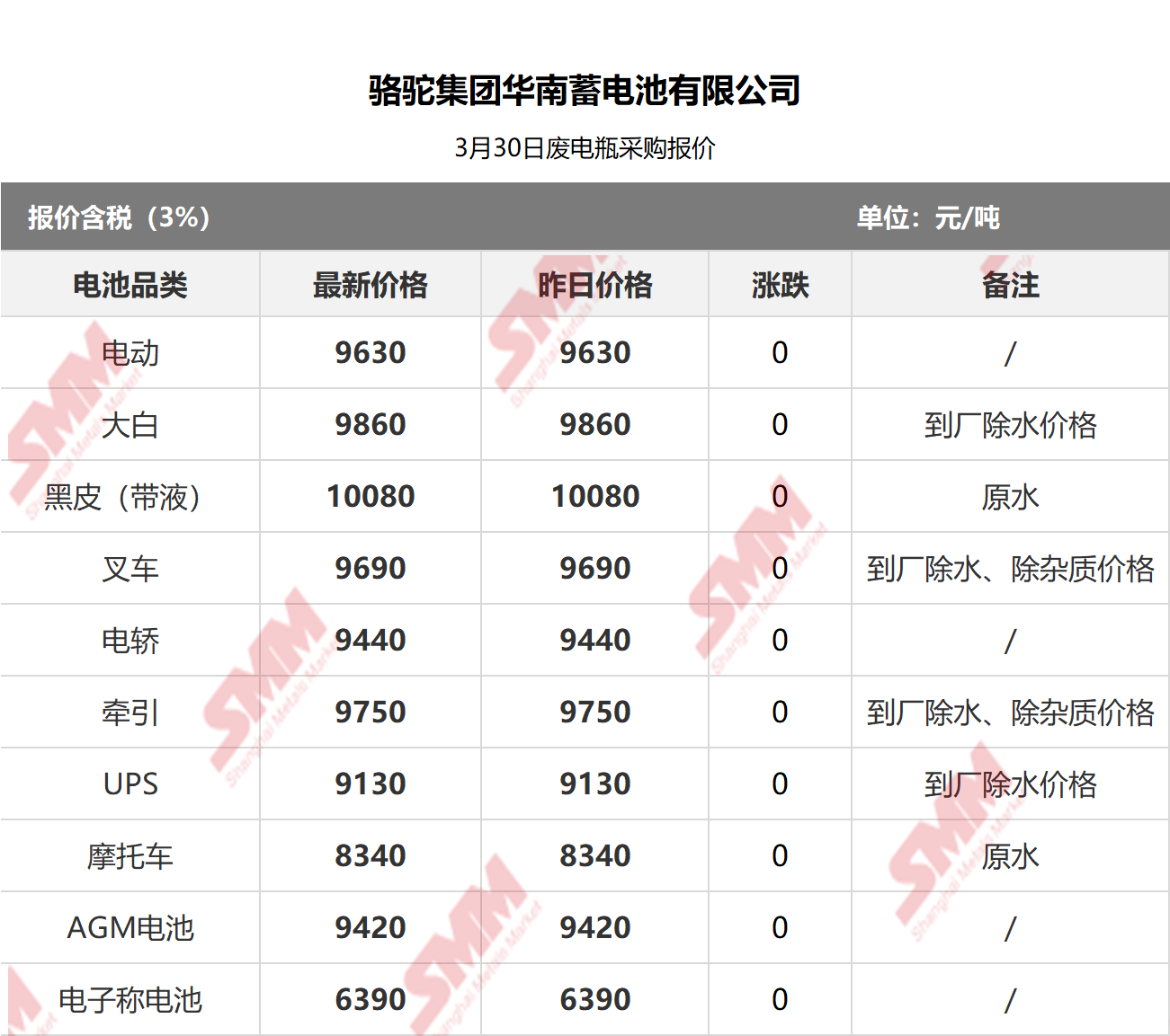 SMM 2026/3/30 国内知名再生铅企业废电瓶采购报价