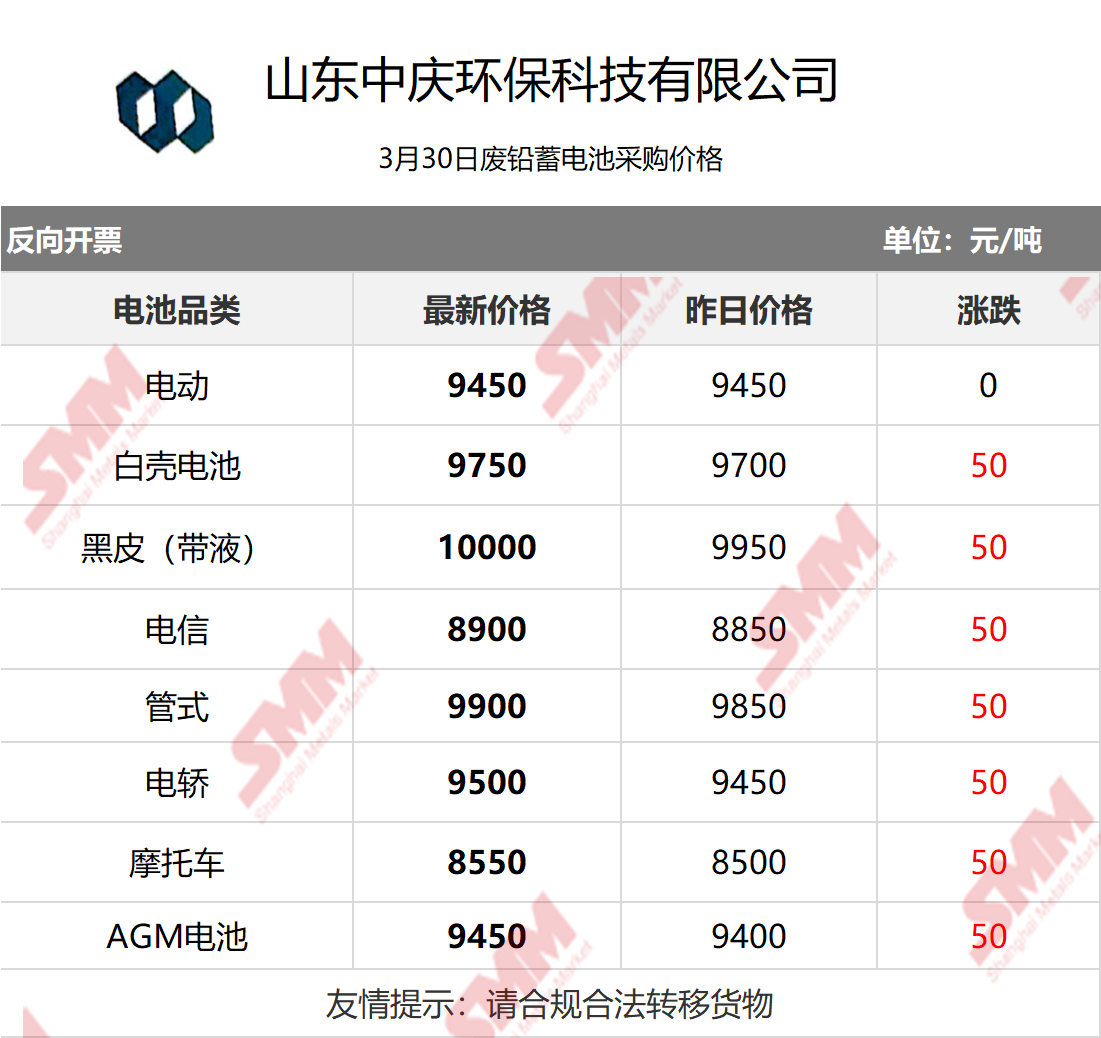 SMM 2026/3/30 国内知名再生铅企业废电瓶采购报价