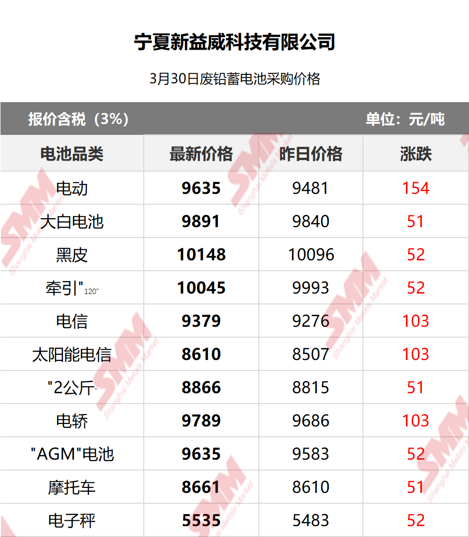 SMM 2026/3/30 国内知名再生铅企业废电瓶采购报价