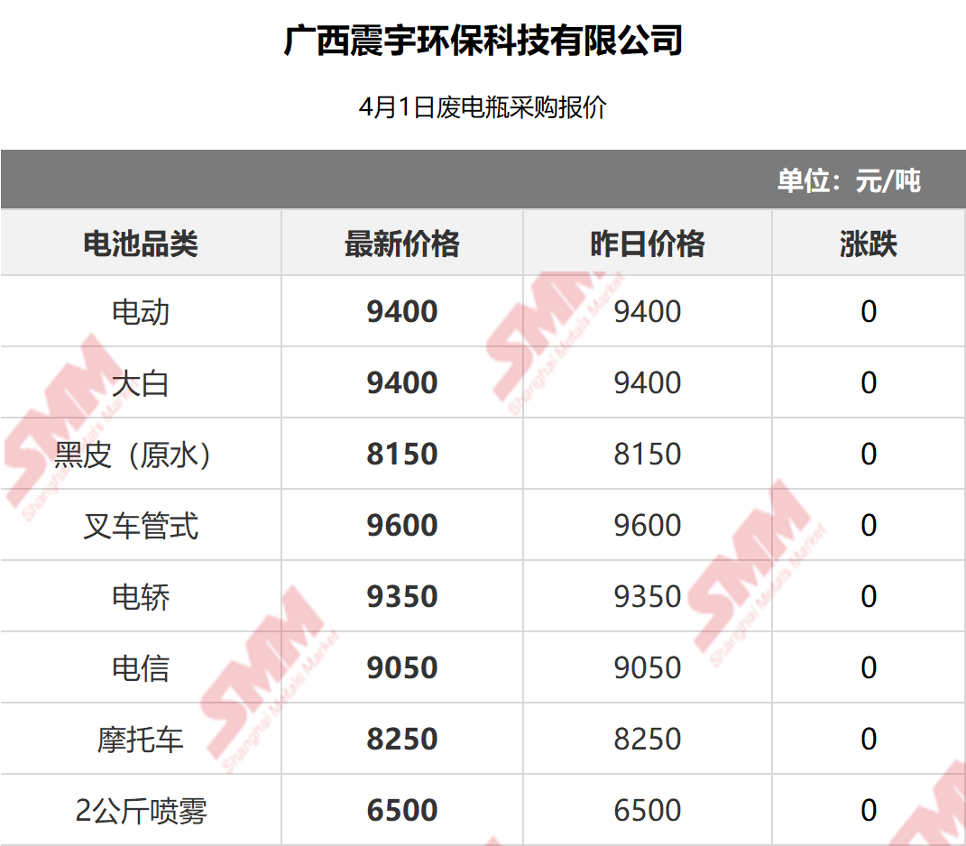 SMM 2026/4/1 国内知名再生铅企业废电瓶采购报价