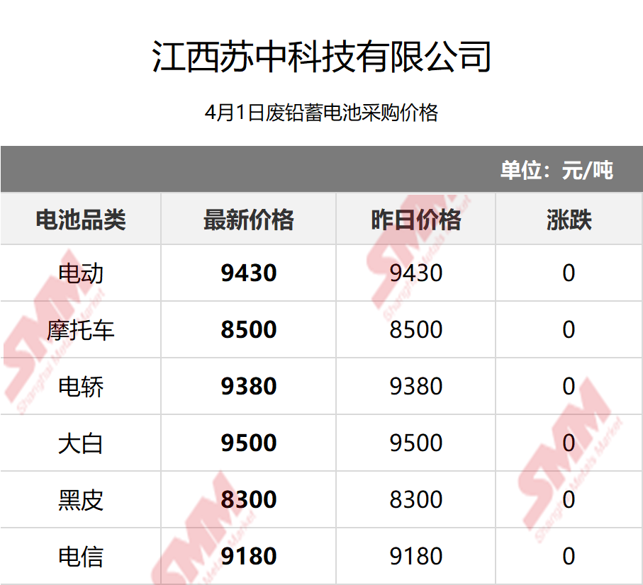 SMM 2026/4/1 国内知名再生铅企业废电瓶采购报价