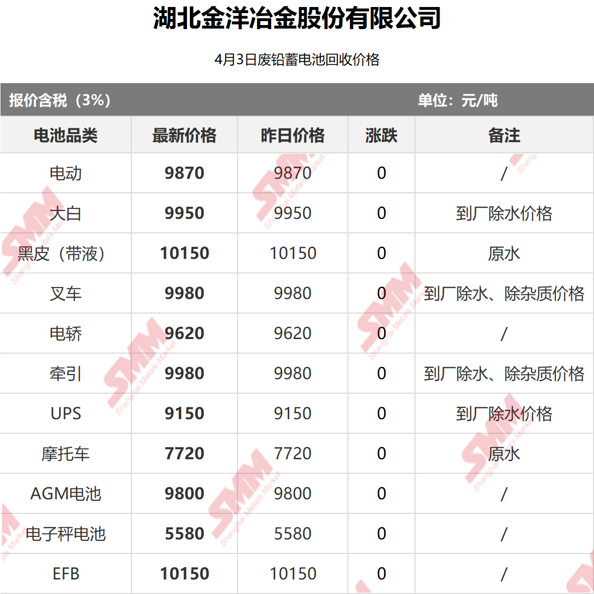 SMM 2026/4/3 国内知名再生铅企业废电瓶采购报价
