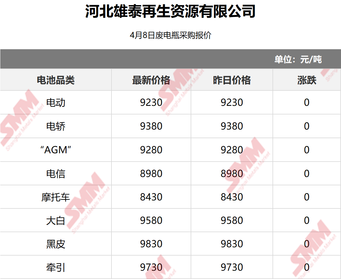 SMM 2026/4/8 国内知名再生铅企业废电瓶采购报价