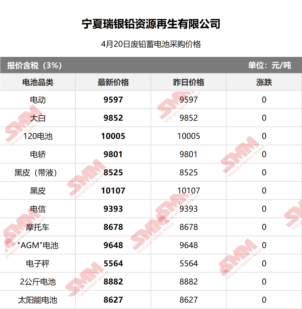 SMM 2026/4/20 国内知名再生铅企业废电瓶采购报价