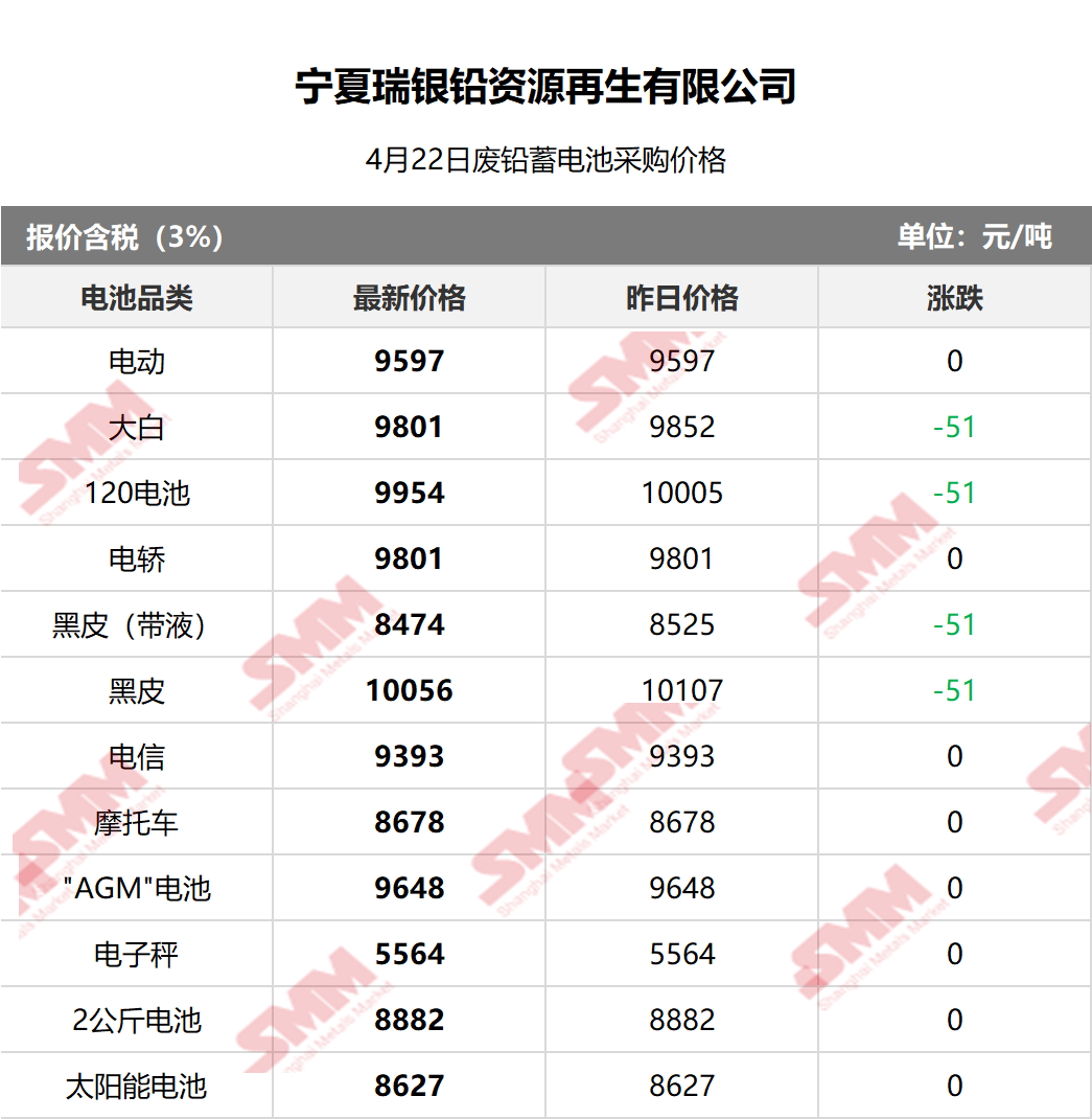 4月22日宁夏瑞银 废电瓶采购报价