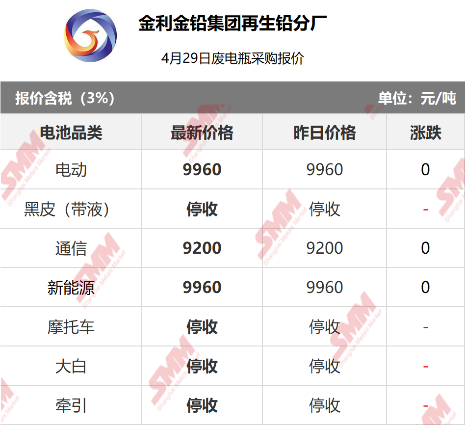 SMM 2026/4/28 国内知名再生铅企业废电瓶采购报价