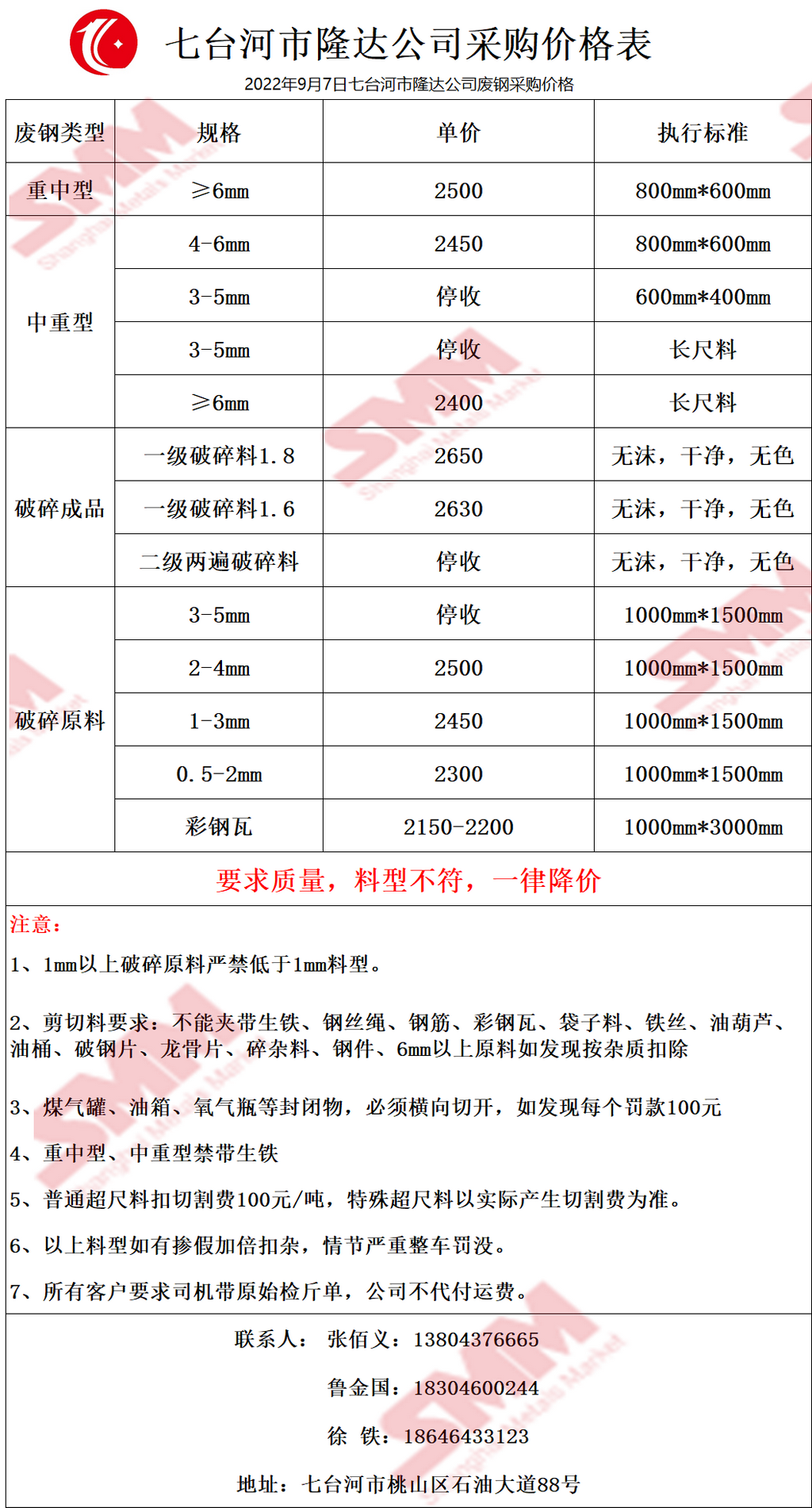 今日 七台河市隆达公司 废钢采购报价已更新,有货的朋友欢迎联系我们!