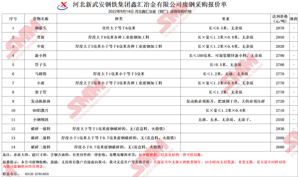 9月14日河北鑫汇冶金 废钢采购报价