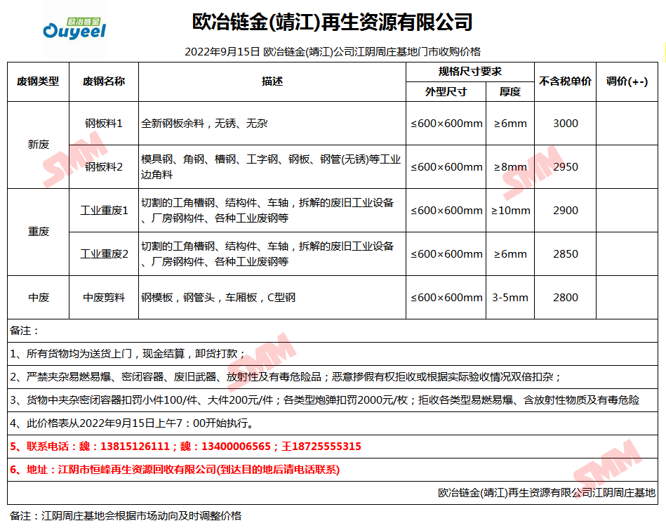 9月15日欧冶链金靖江公司 废钢收购报价