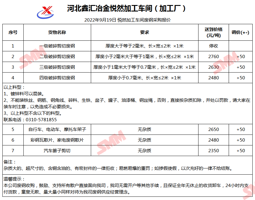 9月19日河北鑫汇冶金悦然加工车间 废钢采购报价