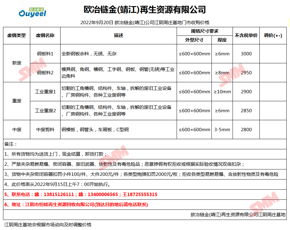 9月20日欧冶链金靖江公司 废钢收购报价