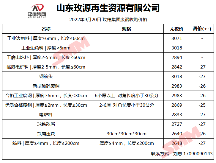 9月20日山东玫源再生 废钢收购报价