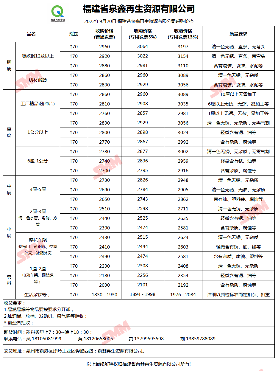 9月20日福建泉鑫再生 废钢采购报价