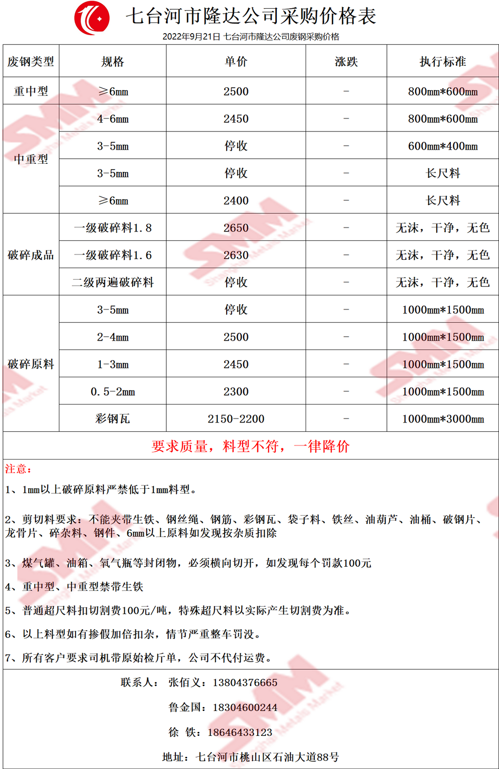 今日 七台河市隆达公司 废钢采购报价已更新,有货的朋友欢迎联系我们!