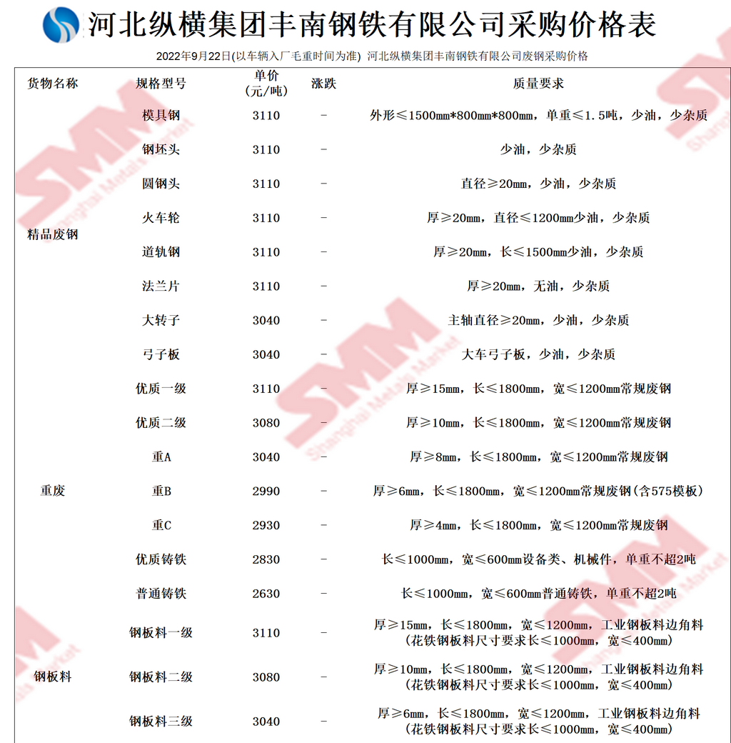 9月22日河北纵横集团丰南钢铁 废钢采购报价