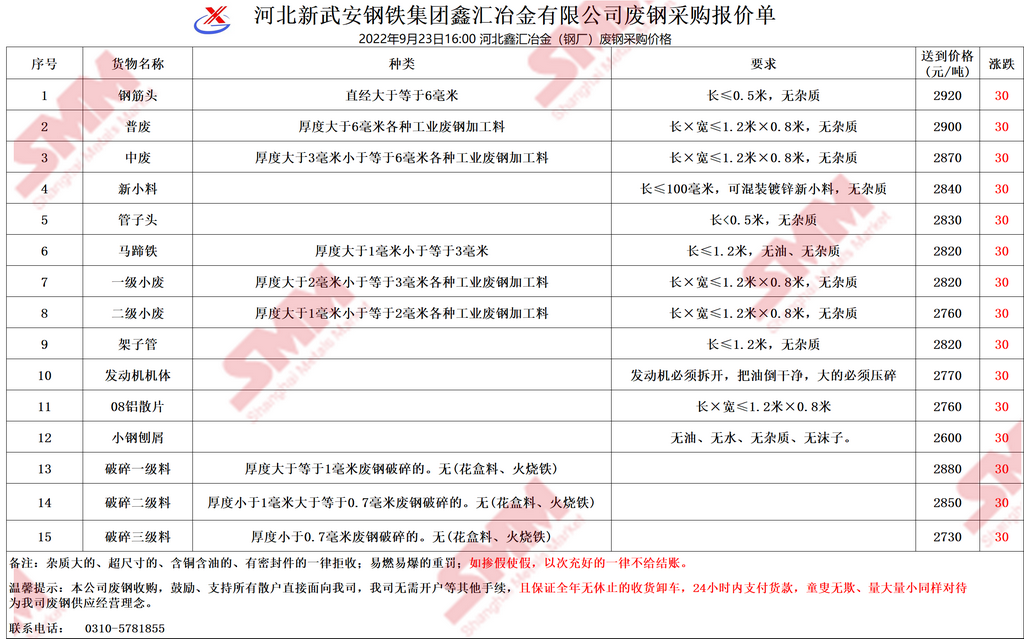 9月23日河北鑫汇冶金 废钢采购二次报价