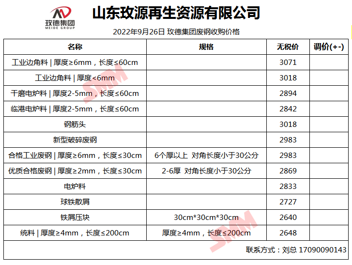 9月26日山东玫源再生 废钢收购报价
