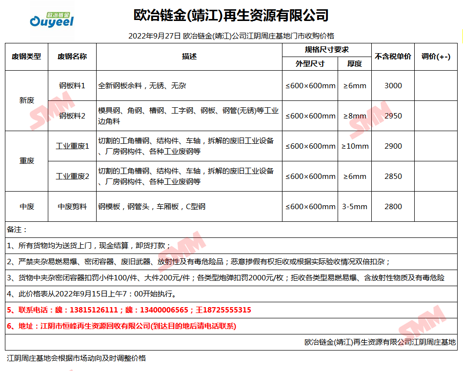 9月27日欧冶链金靖江公司 废钢收购报价