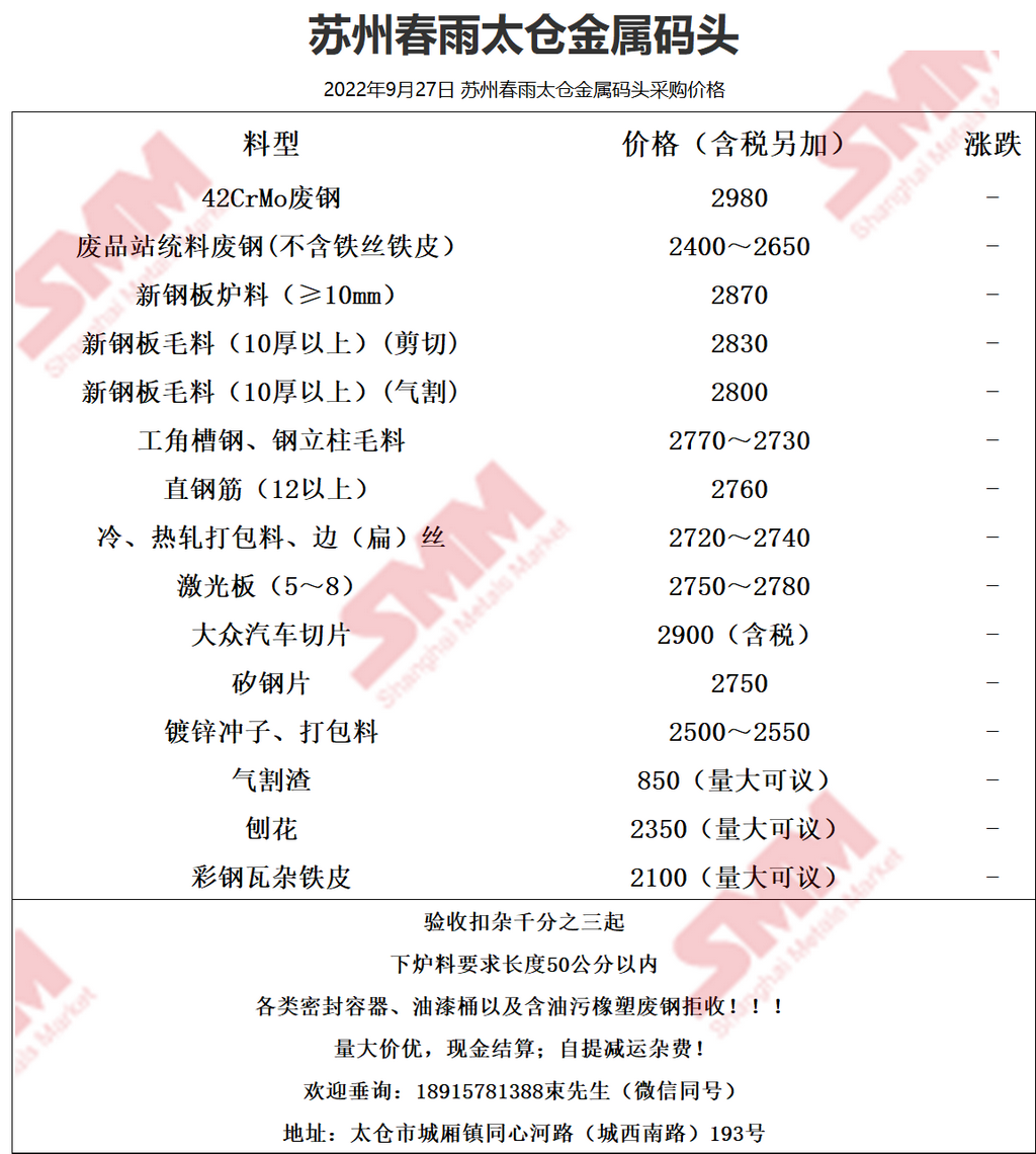 9月27日苏州春雨 废钢采购报价