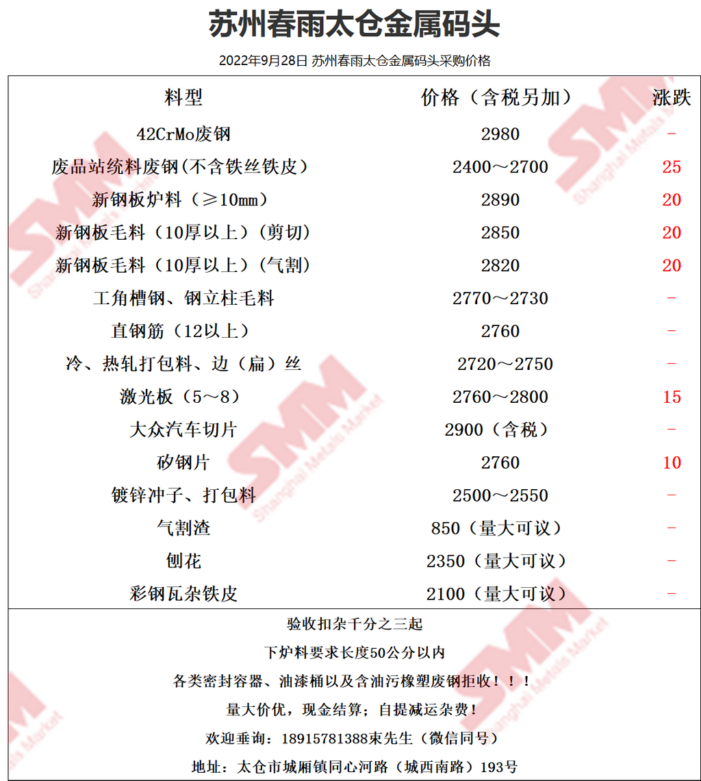 9月28日苏州春雨 废钢采购报价