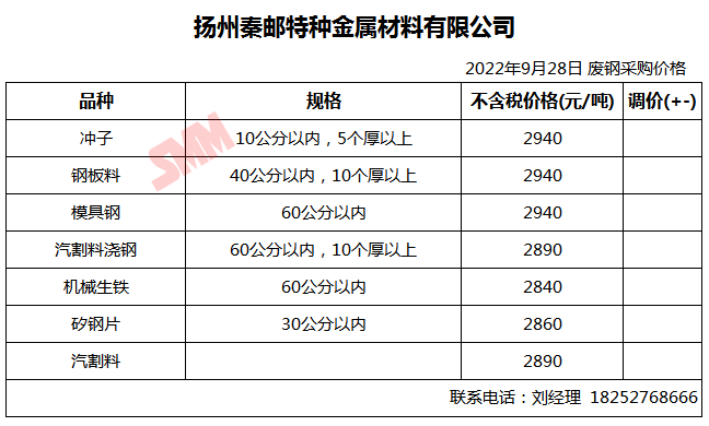 9月28日秦邮特钢 废钢采购报价