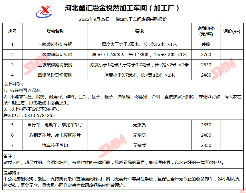 9月29日河北鑫汇冶金悦然加工车间 废钢采购报价