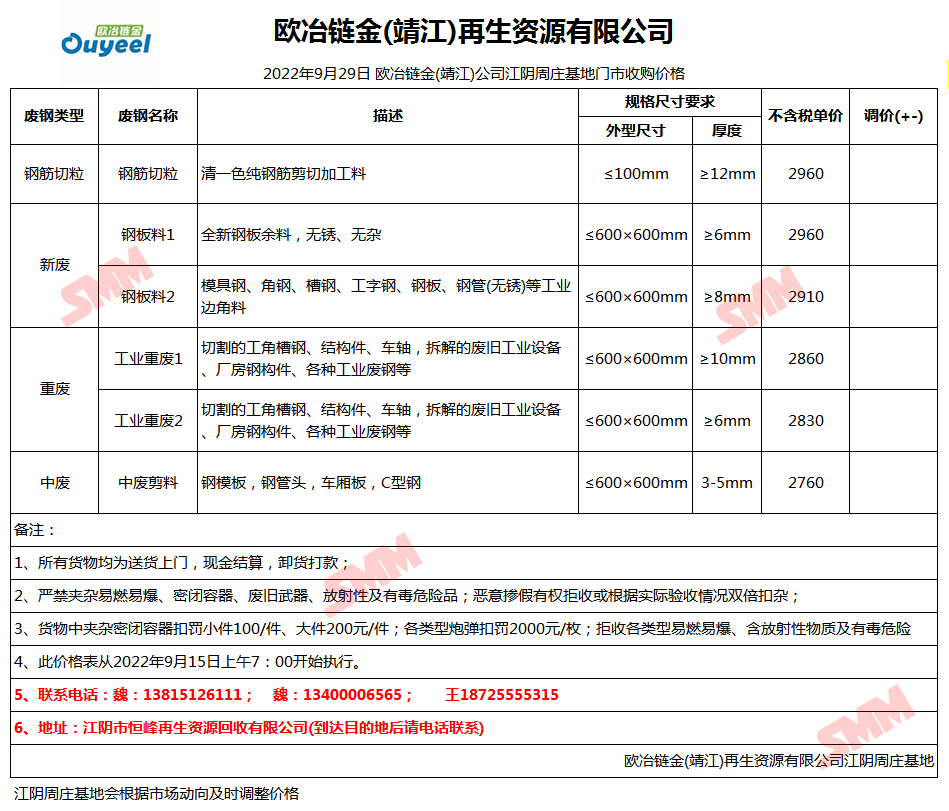 9月29日欧冶链金靖江公司 废钢收购报价