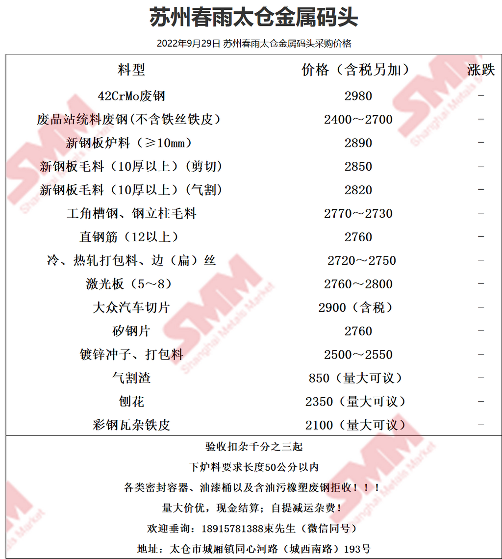 今日 苏州春雨太仓金属码头 废钢采购报价已更新,有货的朋友欢迎联系我们!