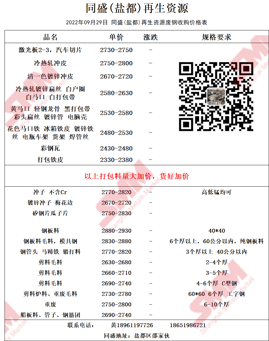 9月29日同盛(盐都)再生资源 废钢收购报价