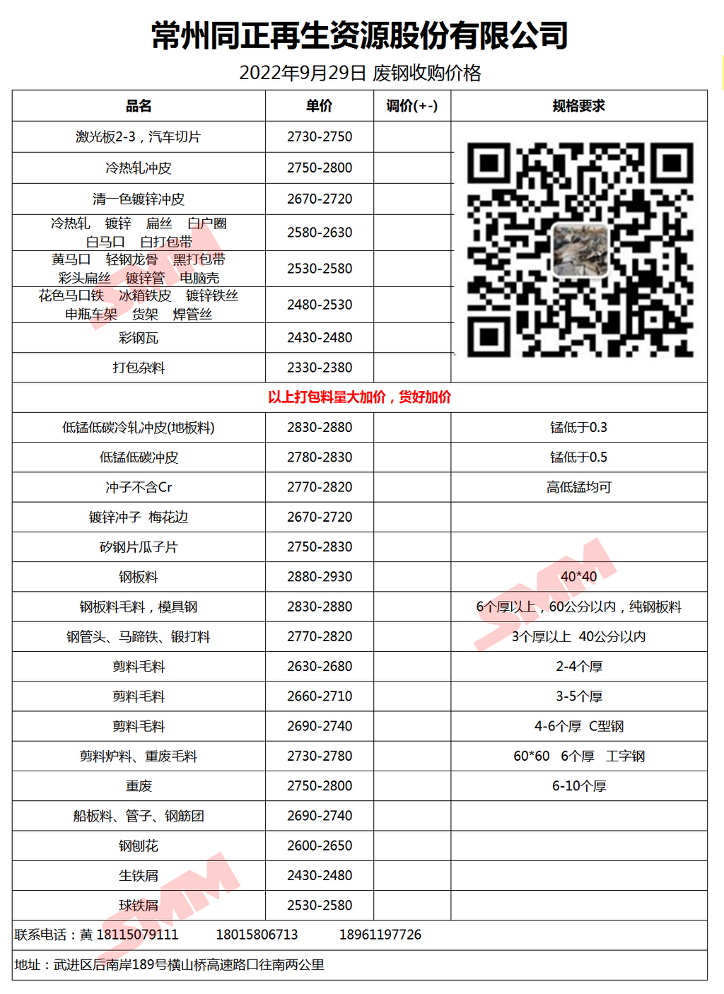 9月29日常州同正再生资源 废钢收购报价