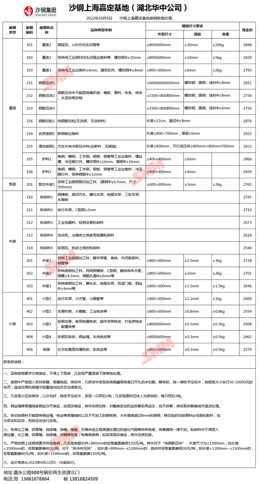 10月9日沙钢上海嘉定基地 废钢收购报价