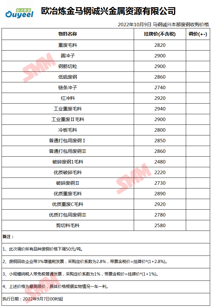 10月9日欧冶链金马钢诚兴 废钢收购报价