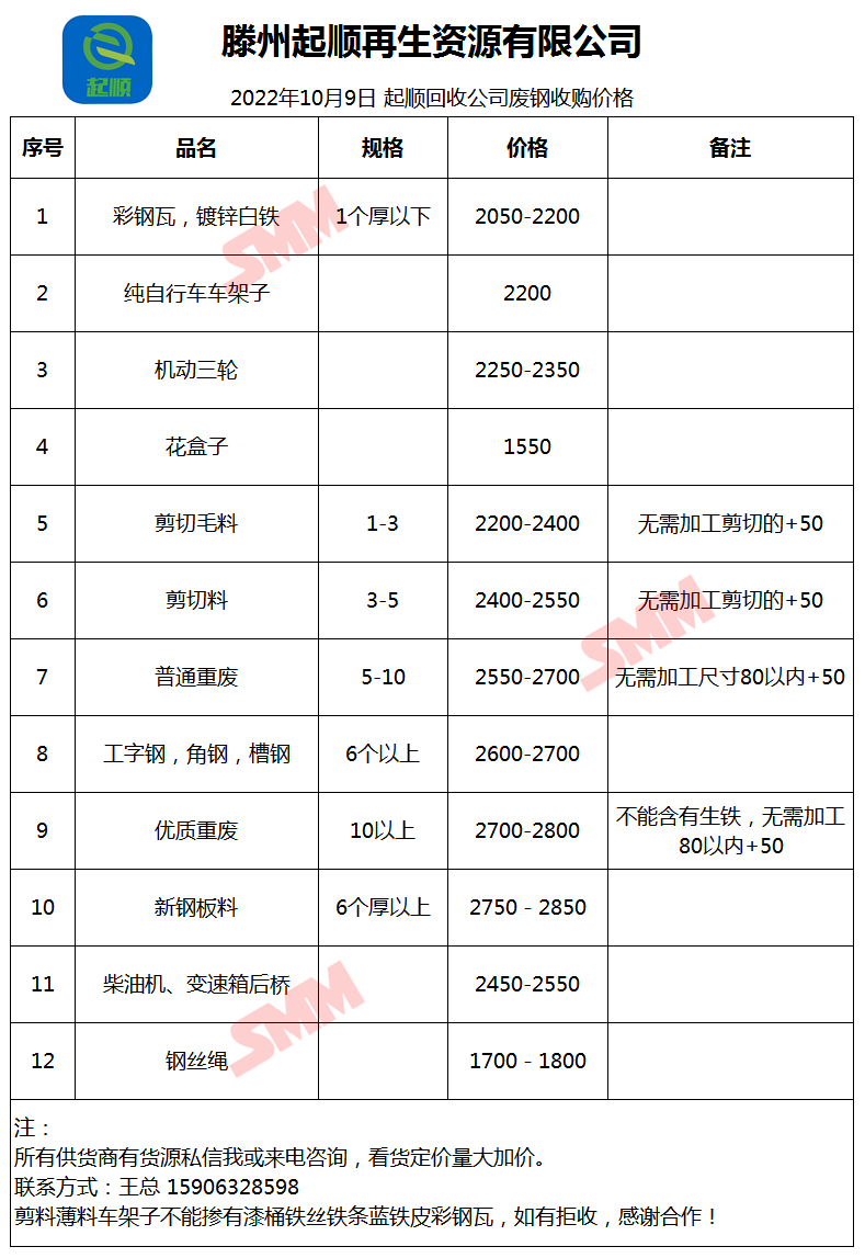 10月9日滕州起顺再生 废钢收购报价