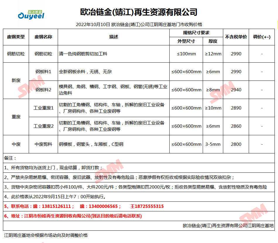 今日欧冶链金靖江公司 废钢收购报价已更新,有货的朋友欢迎联系我们!