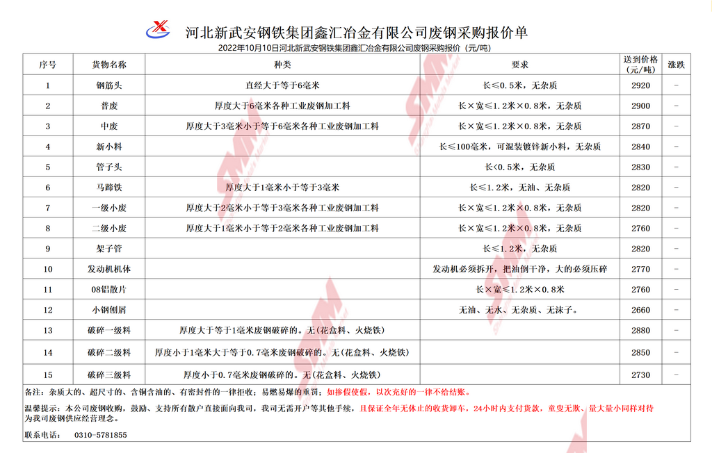 10月10日河北鑫汇冶金 废钢采购报价
