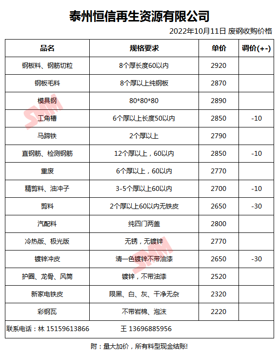 10月11日泰州恒信再生 废钢收购报价