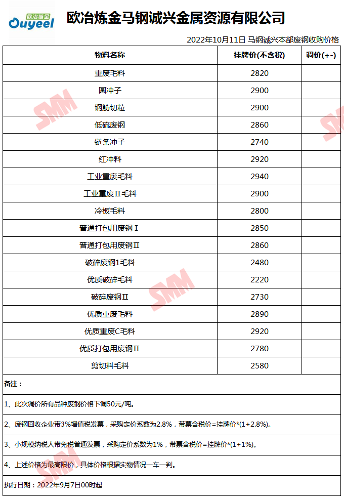 10月11日欧冶链金马钢诚兴 废钢收购报价