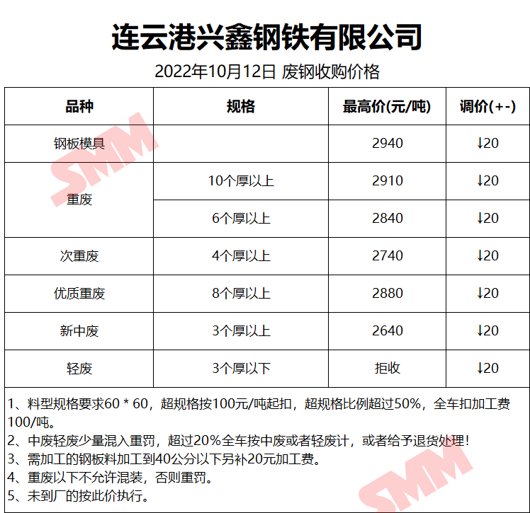 10月12日连云港兴鑫钢铁 废钢收购报价