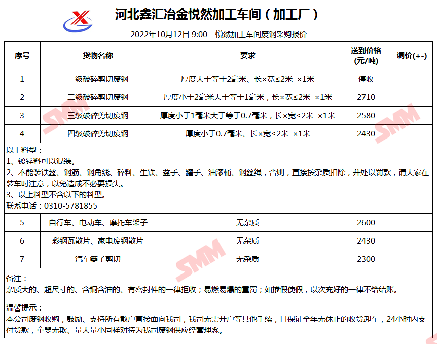 10月12日河北鑫汇冶金悦然加工车间 废钢采购报价