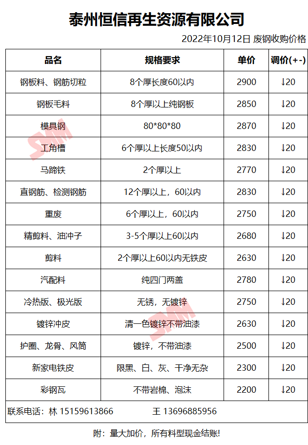 10月12日泰州恒信再生 废钢收购报价