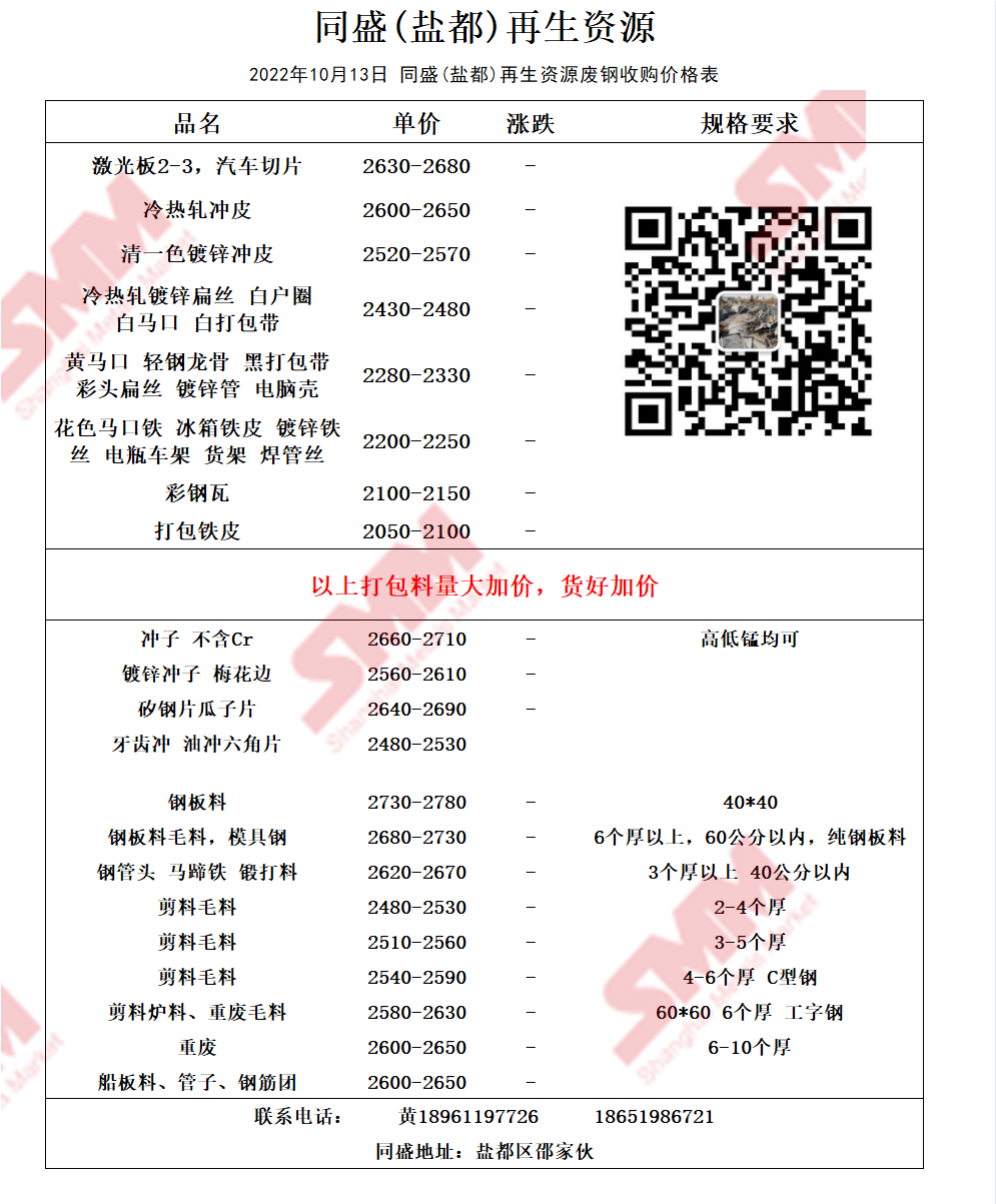 10月13日同盛(盐都)再生资源 废钢收购报价