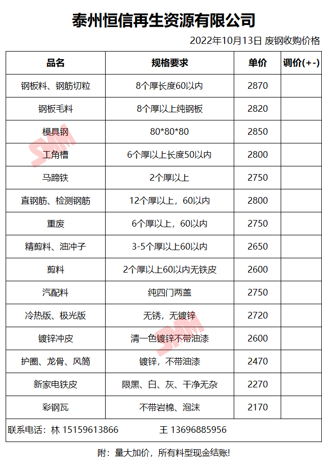 10月13日泰州恒信再生 废钢收购报价