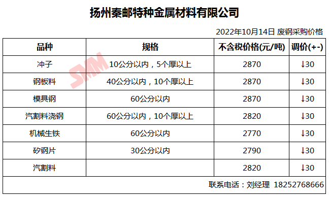 10月14日秦邮特钢 废钢采购报价
