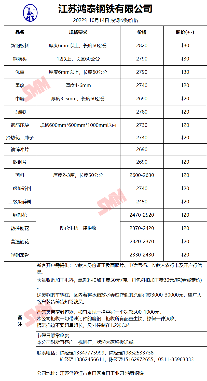 10月14日江苏鸿泰钢铁 废钢收购报价